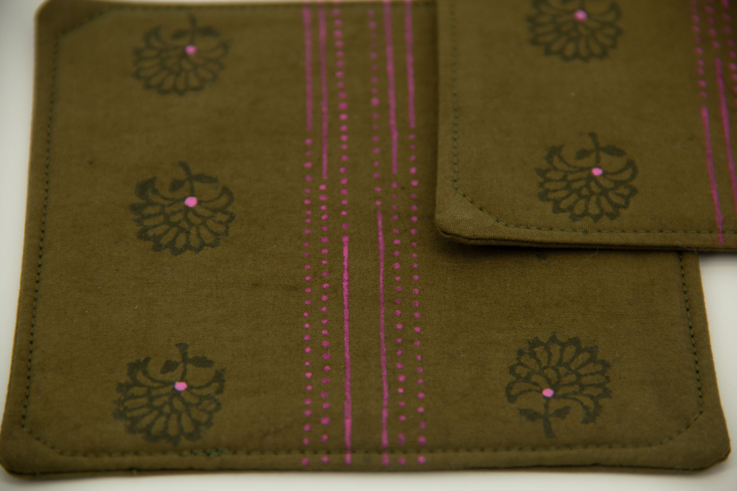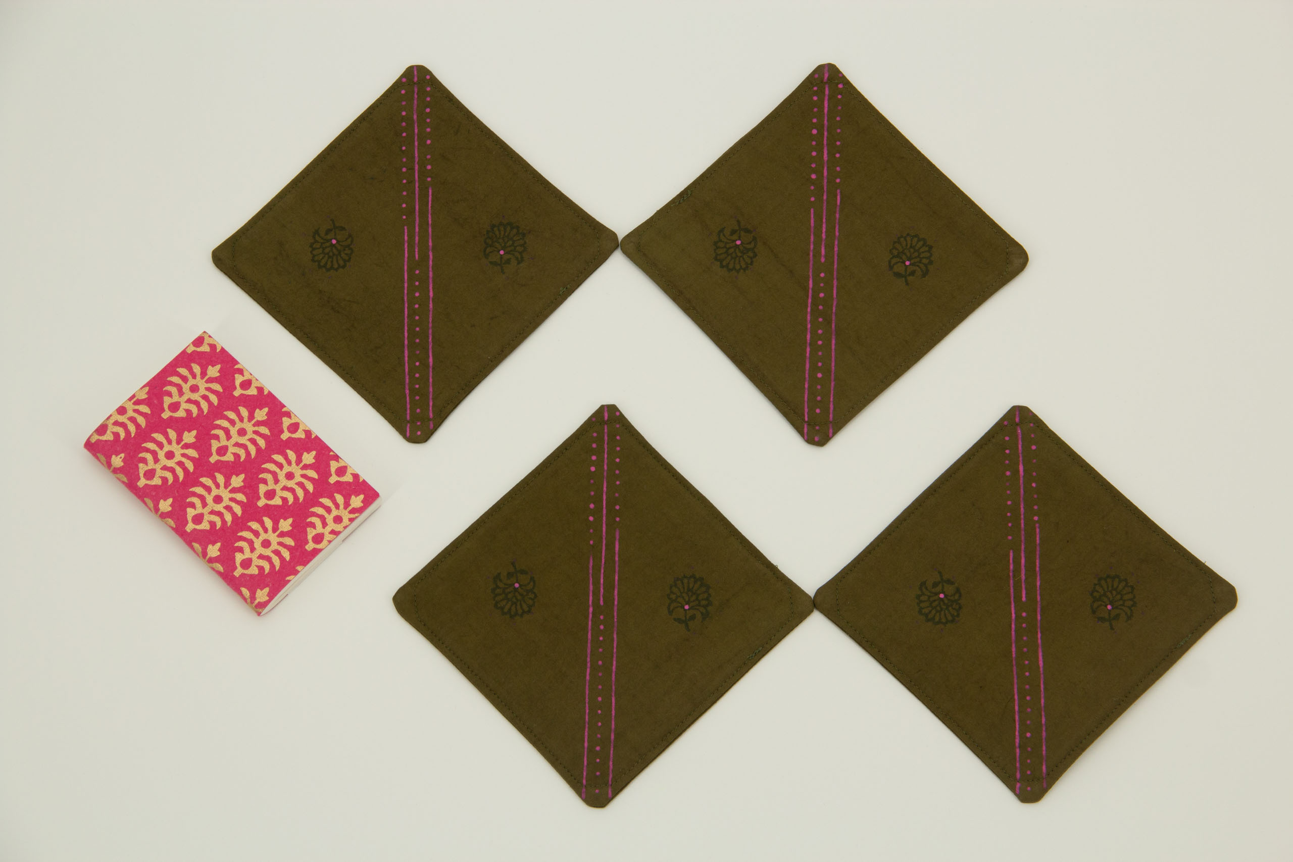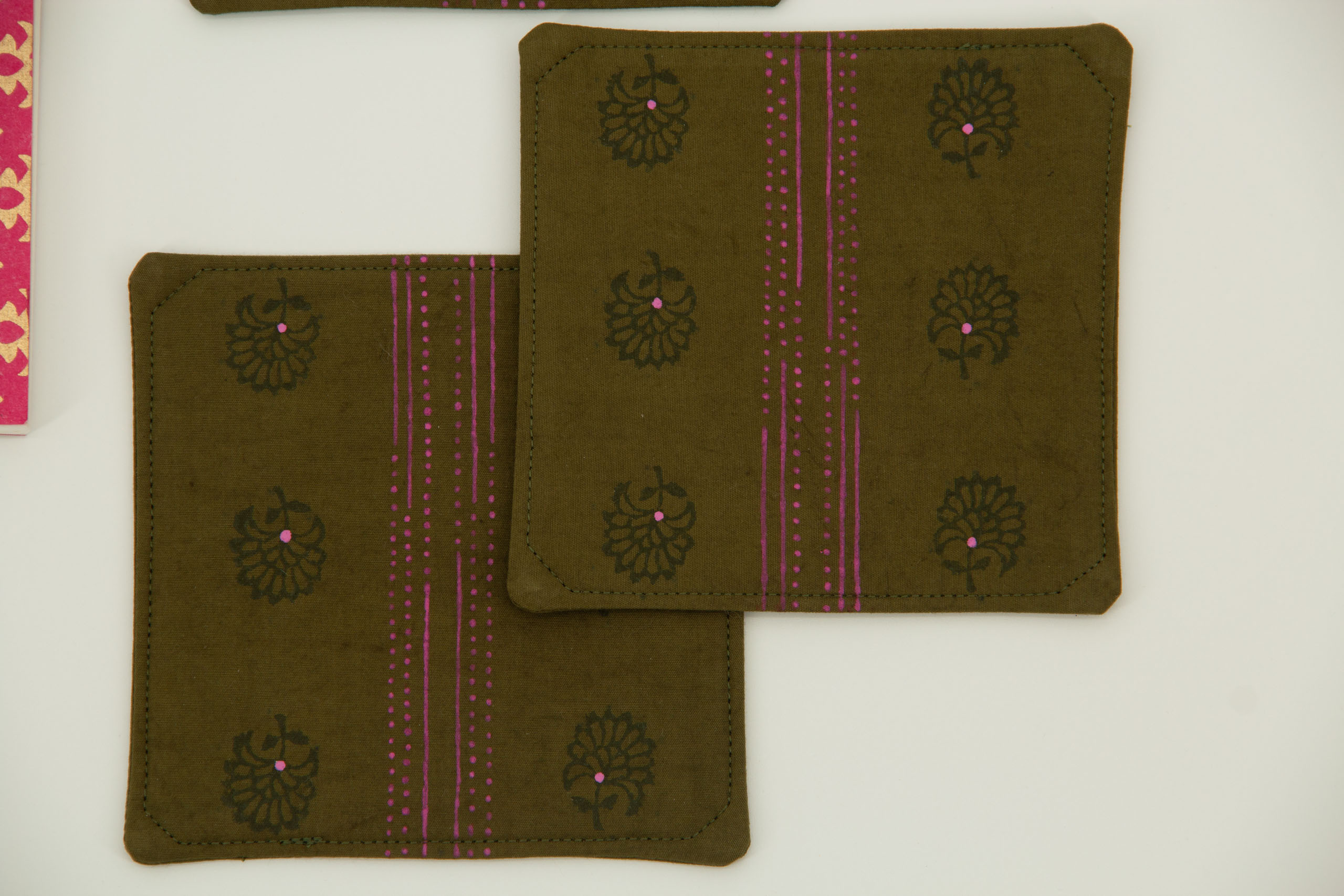 A set of four coasters with woodblock and hand-drawn designs in green and pink on olive green hand-dyed cotton. These coasters are printed on both sides.