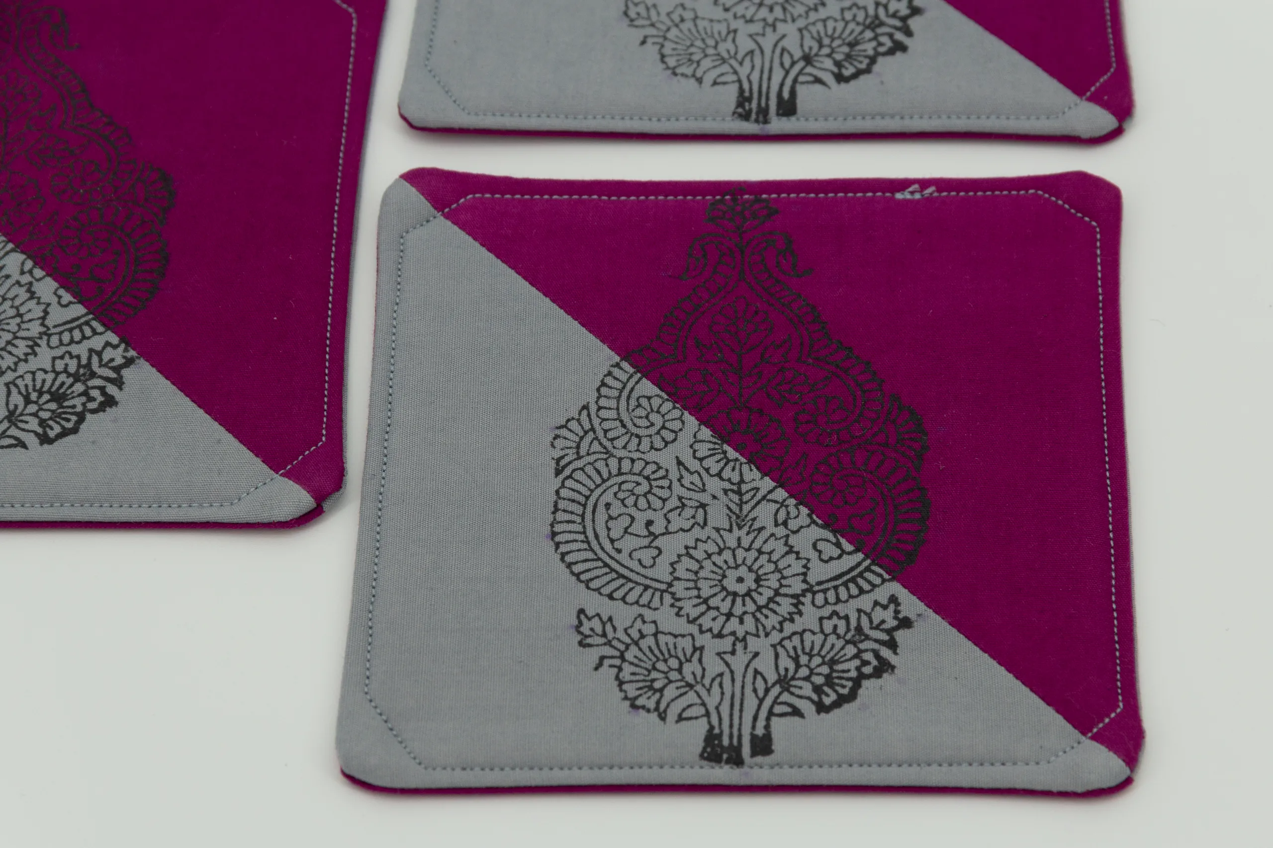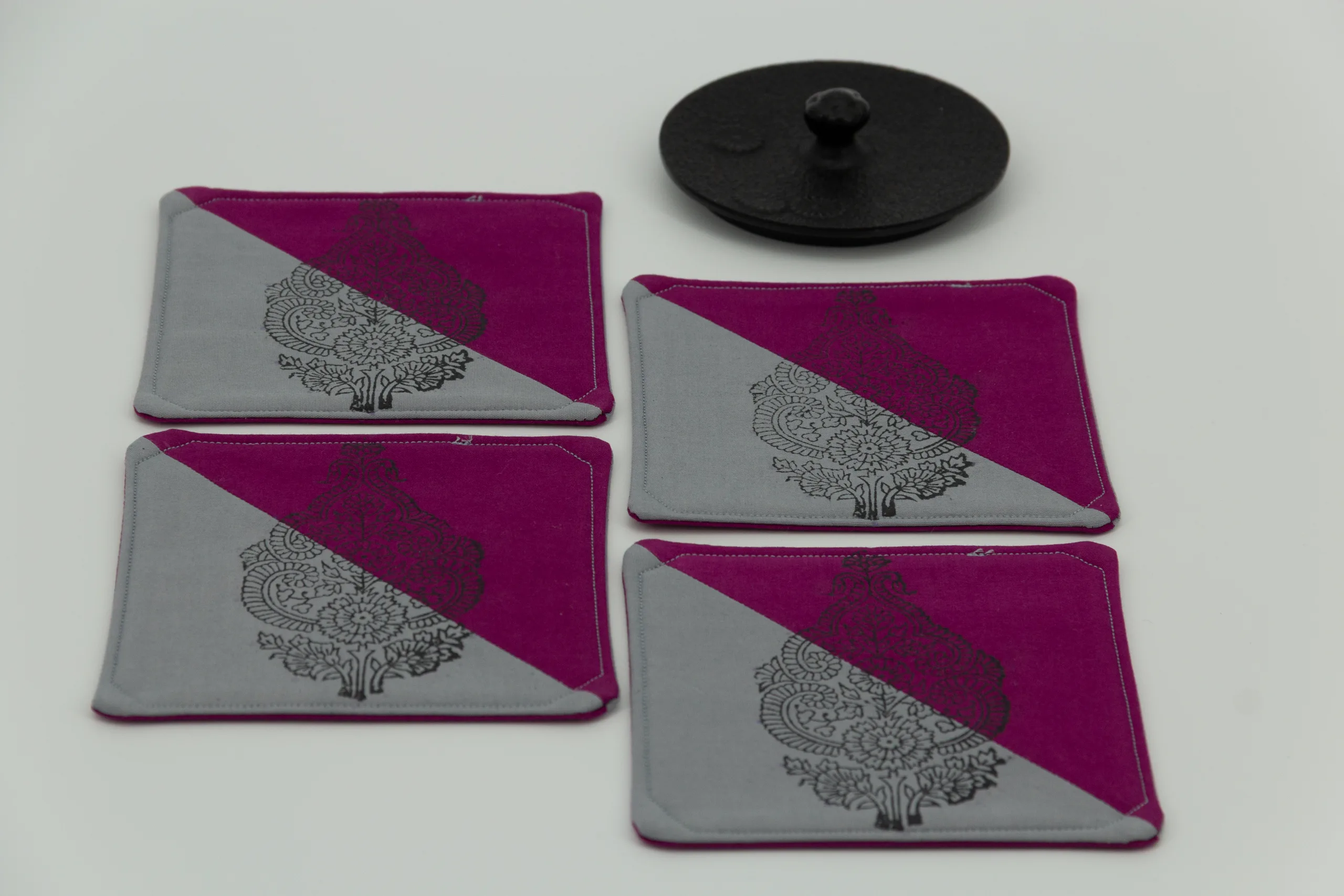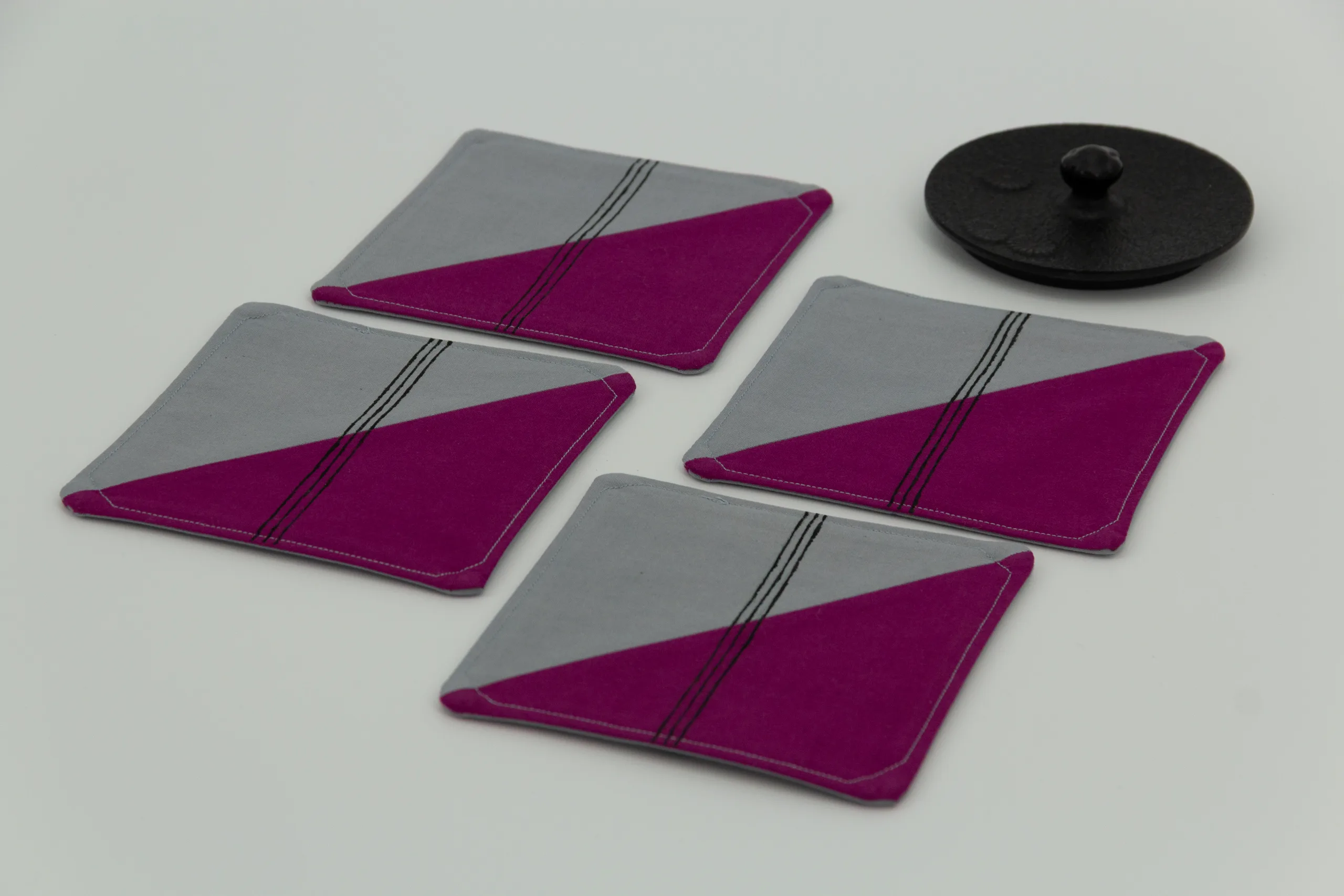 A set of four coasters in grey and plum, with a woodblock design on one side and a hand-drawn line pattern on the reverse.