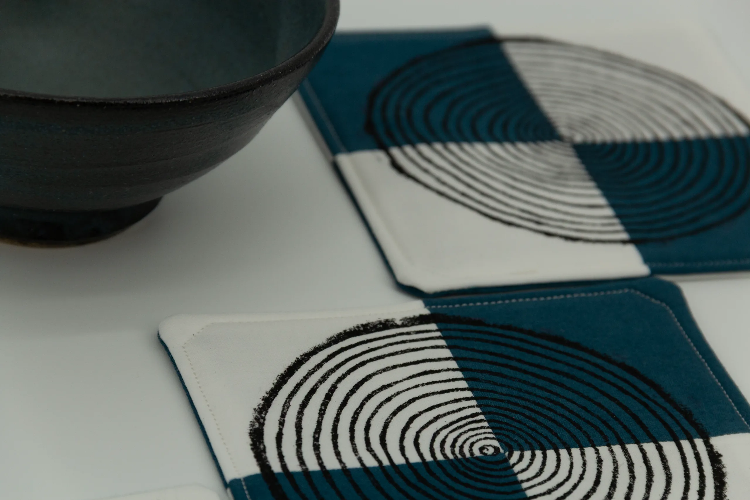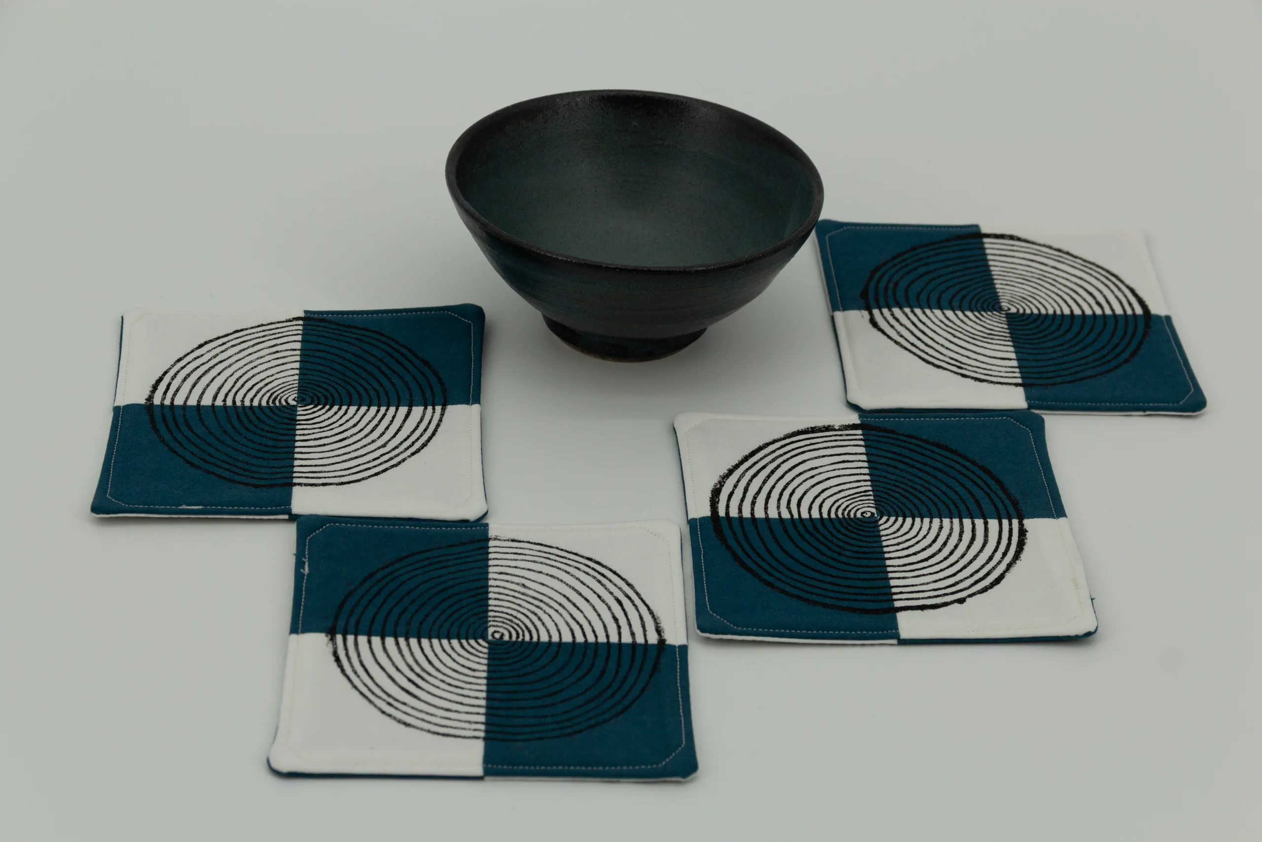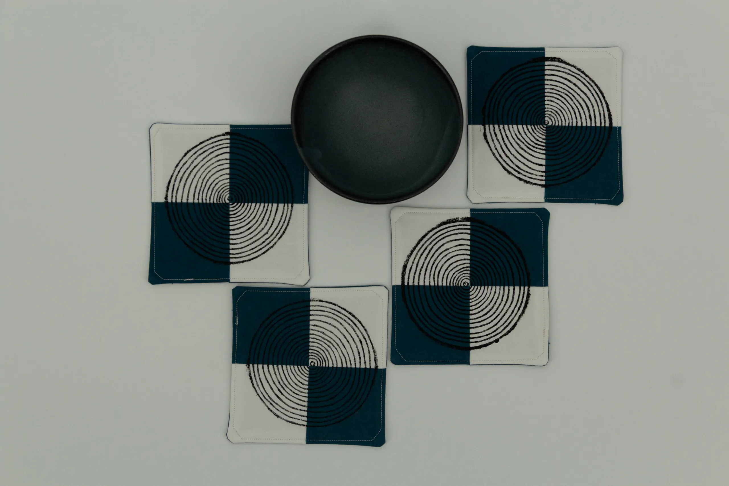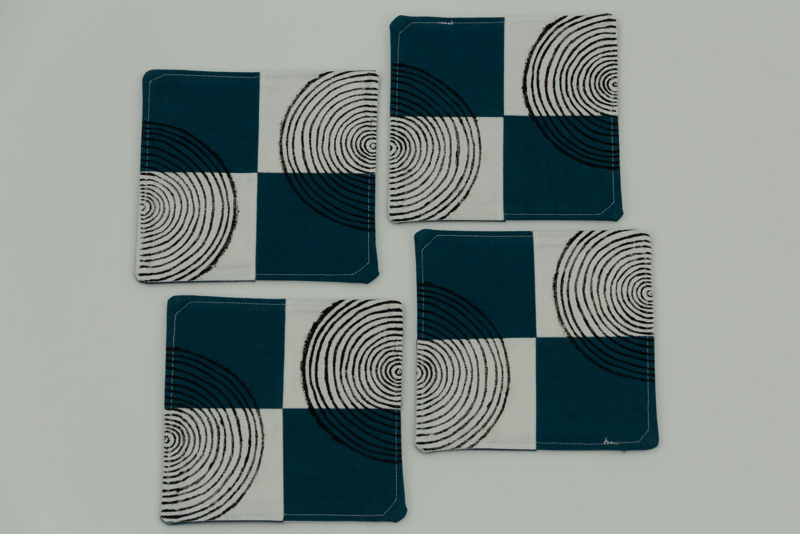 A set of four coasters with cool cream and teal squares printed with a minimalist contemporary woodblock print. These coasters feature different designs on either side. Everything sold on Kokuin is handmade by the owner, Soumya James, including the sewing, printing, and painting.