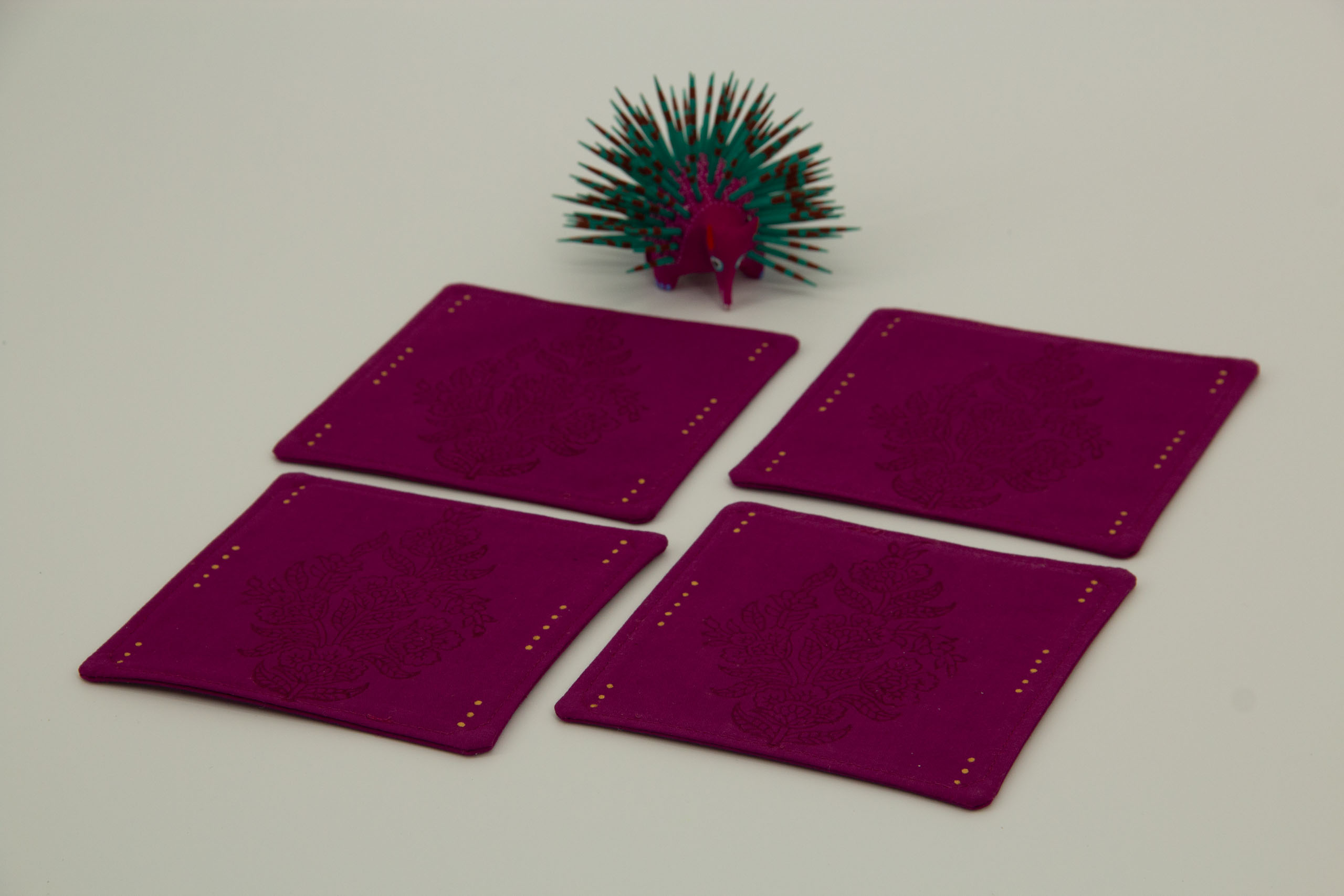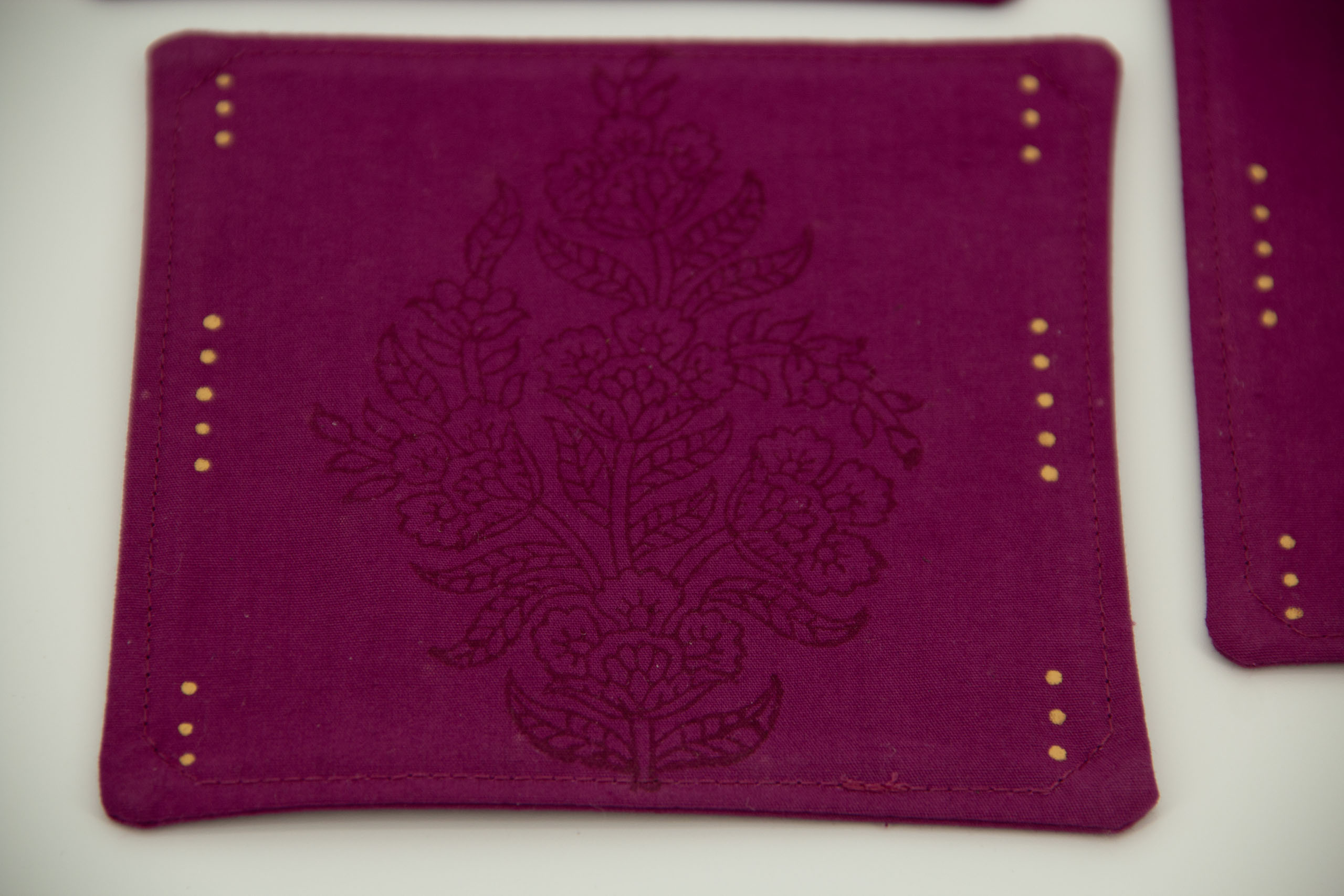 A set of four coasters in deep magenta with oxblood prints. The hand-dyed cotton coasters have patterns on both sides.
