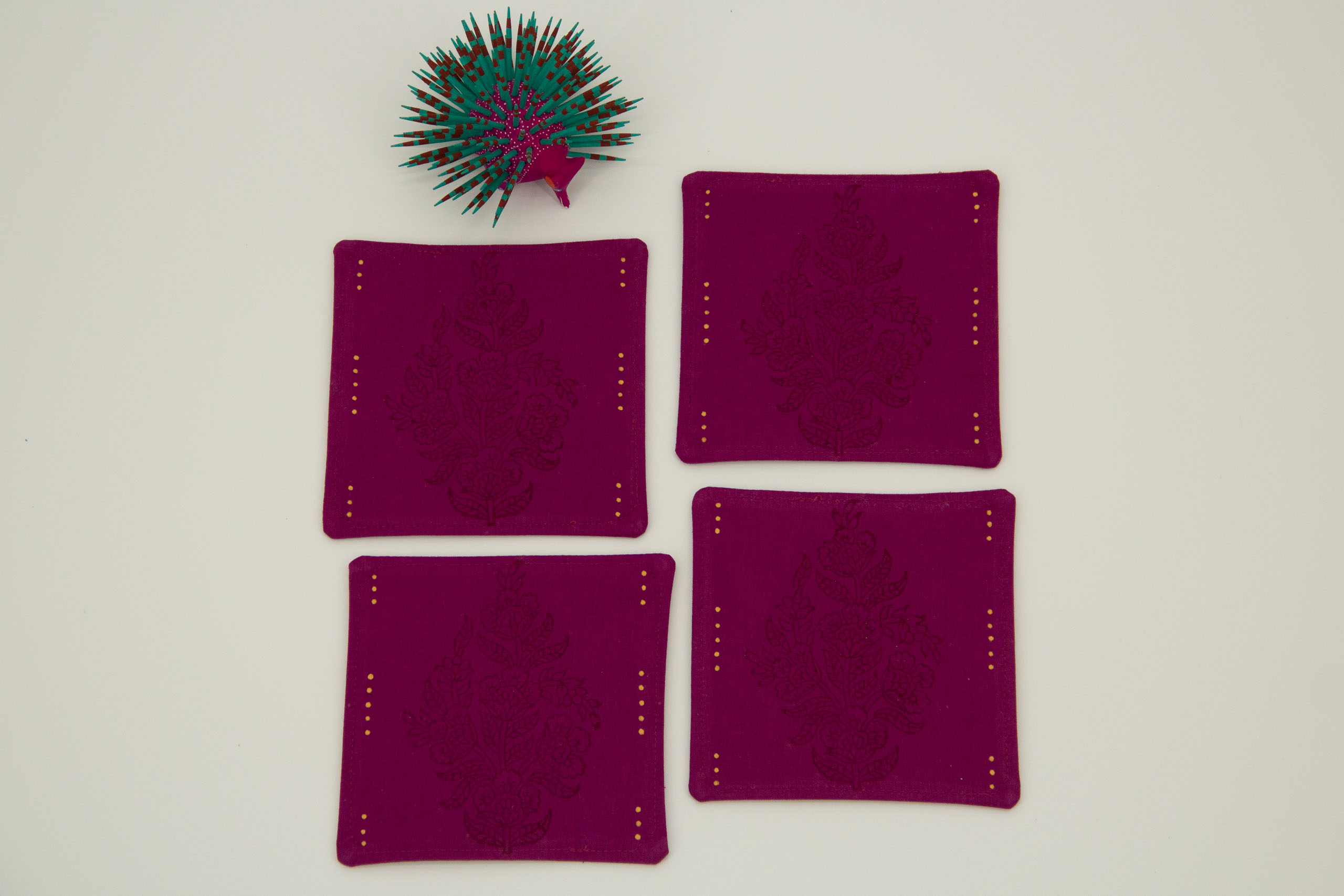 Strategically placed golden yellow dots offer striking counterpoints to the oxblood prints on rich magenta hand-dyed cotton fabric. This set of four statement coasters are printed on both sides. Everything sold on Kokuin is handmade by the owner, Soumya James, including the sewing, printing, and painting.