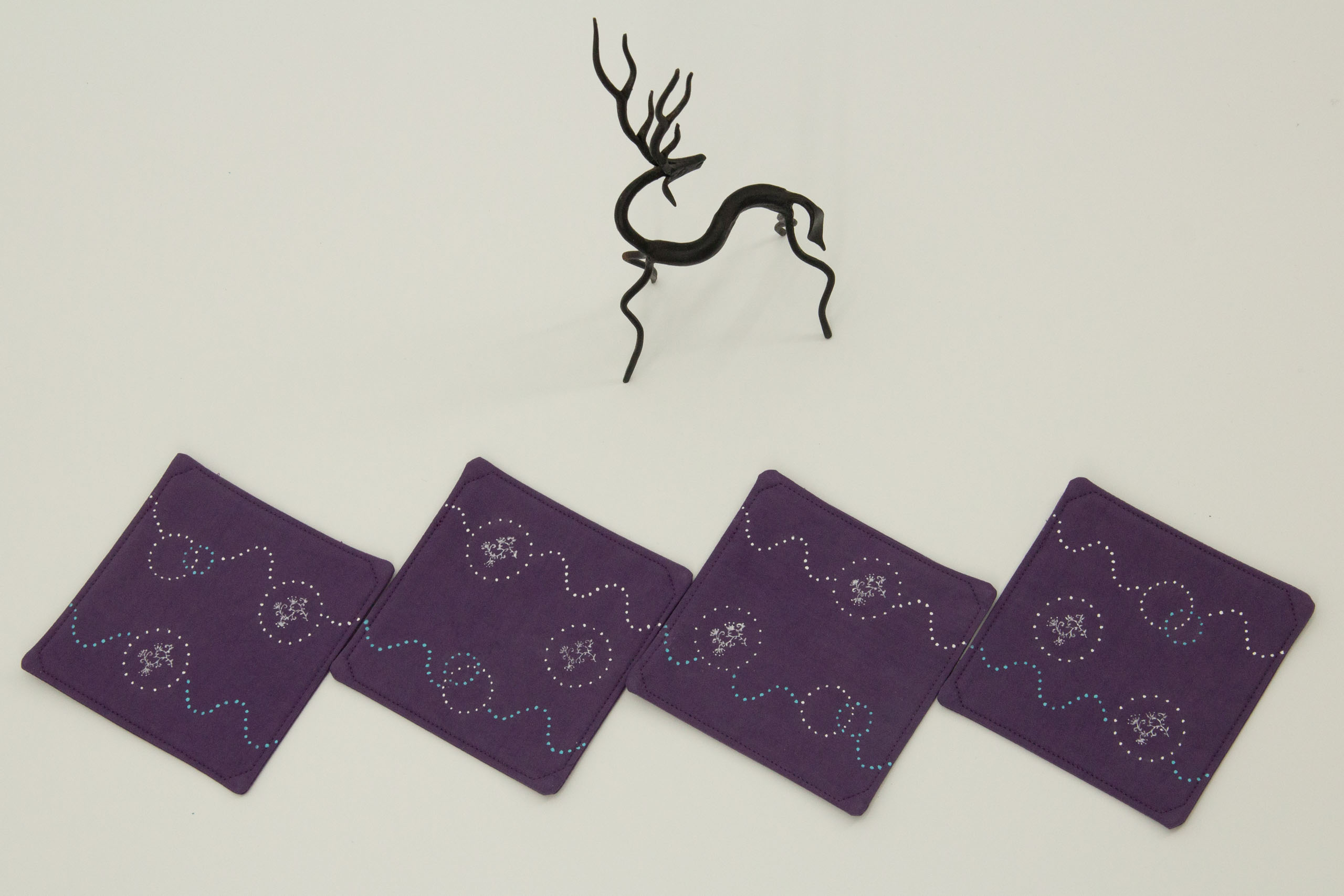 Delicate prints in roundels, carried along by waves add a fun flavor to this set of 4 coasters. These hand-dyed cotton coasters in pleasing purple and white are printed on both sides with different patterns. Everything sold on Kokuin is handmade by the owner, Soumya James, including the sewing, printing, and painting.