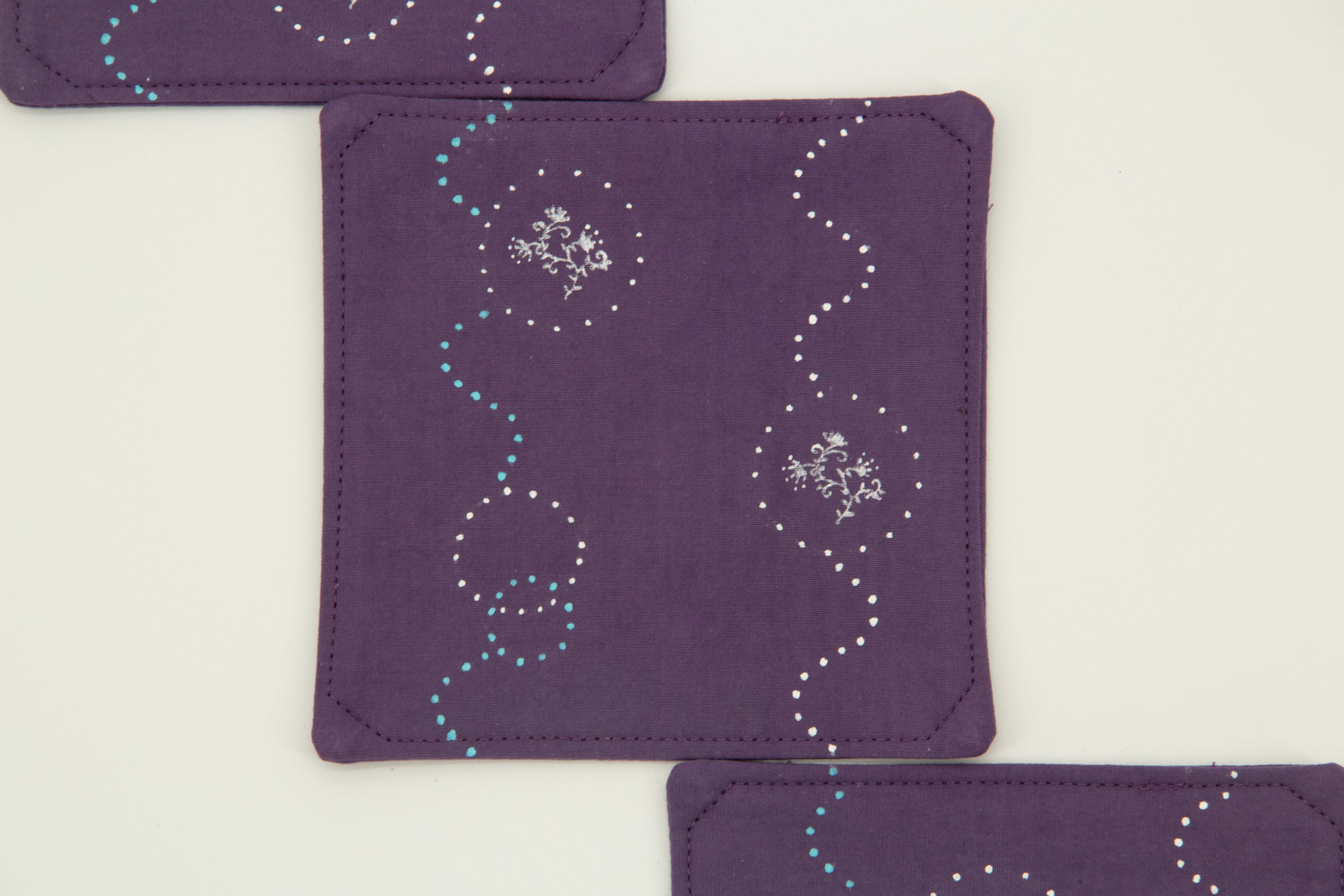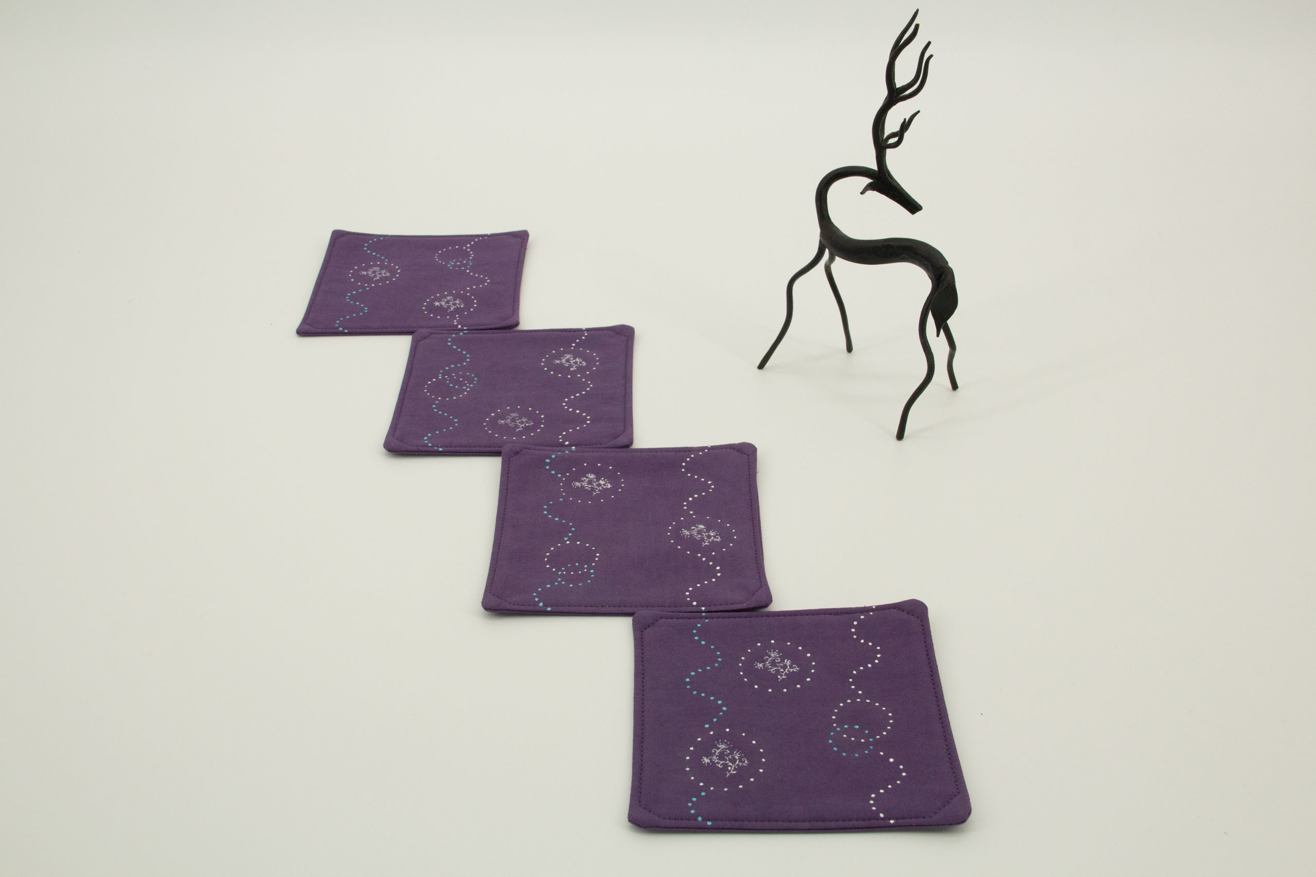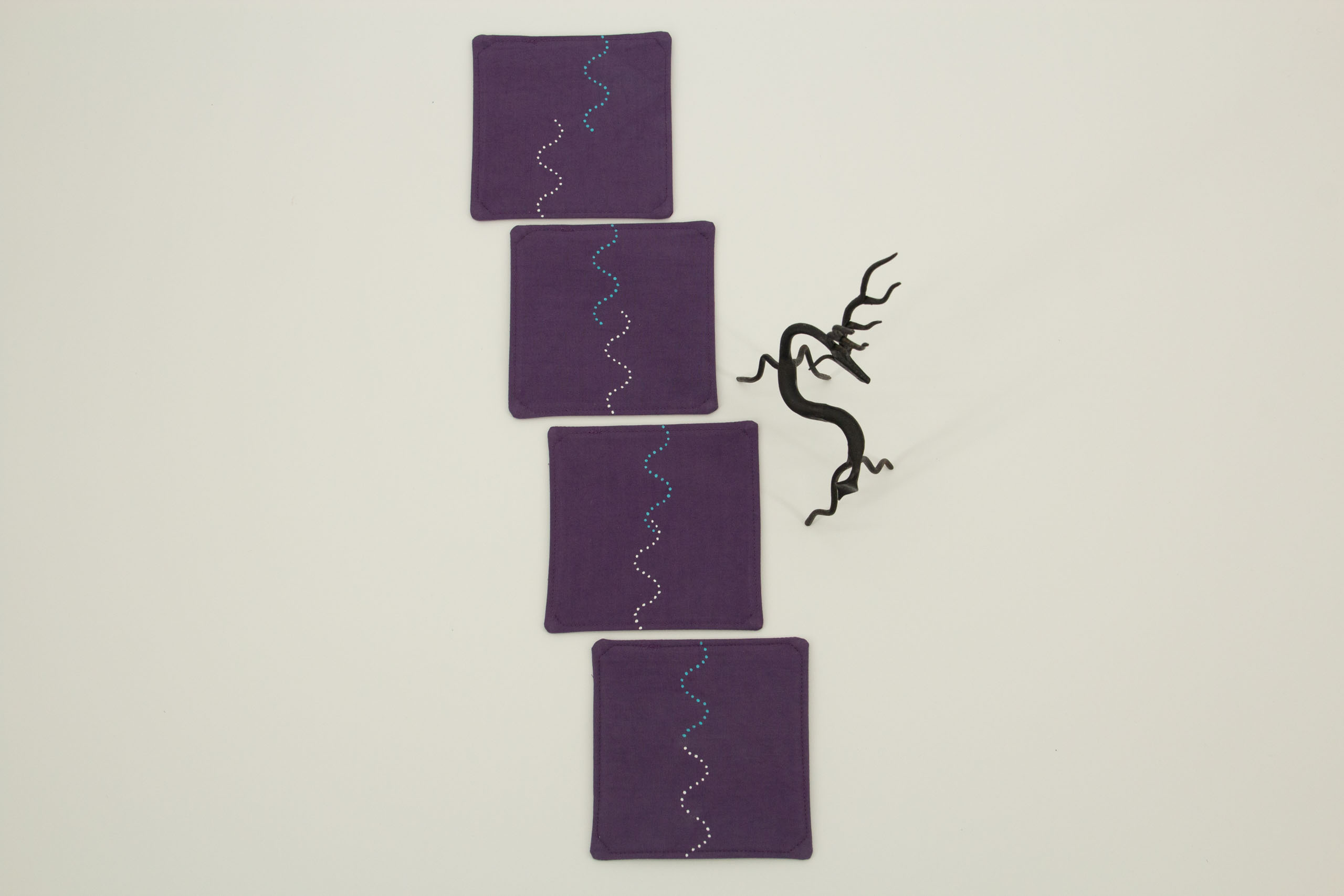 A set of four coasters in purple and white with a fun wave and print design. This set of hand-dyed coasters has prints on both sides.